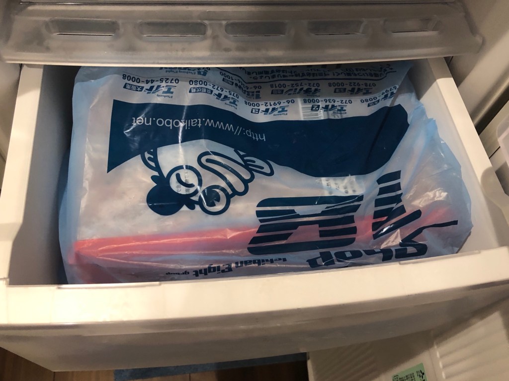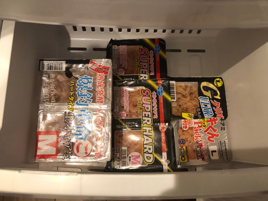 カゴ釣りに行くときは、3kgのオキアミブロックを3個持っていくので、メインの冷蔵庫に入れると冷凍室がパンパンになります。