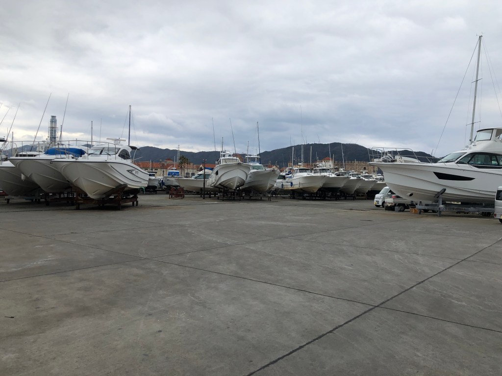 マリーナの話に戻りますが、和歌山マリーナにはヤマハのボートばかり150艇くらいが陸置きされています。全てオオタさんのお客さんです。