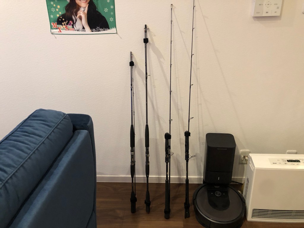 左の2本はシマノのホリデーシリーズ。ホリデーは安くて使いやすいので、磯竿も何本か持っていました。今回のはアジやイサキ用です。右の2本はシマノのジギングロッド。