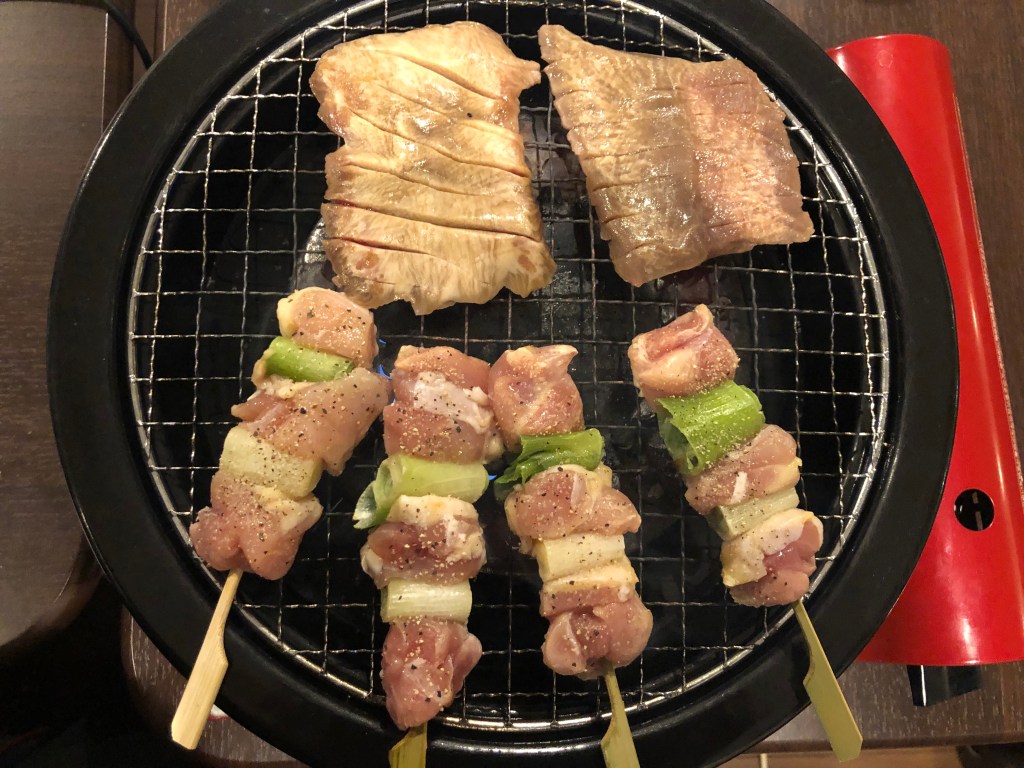 カセットコンロで焼鳥と仙台の牛タン。