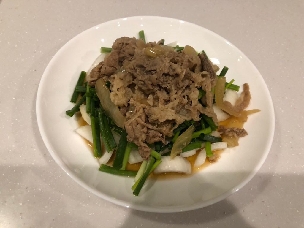 生の玉ねぎとネギをたっぷり底に敷き詰めた牛皿。松屋の牛丼はゴハンがなければ230kcal。