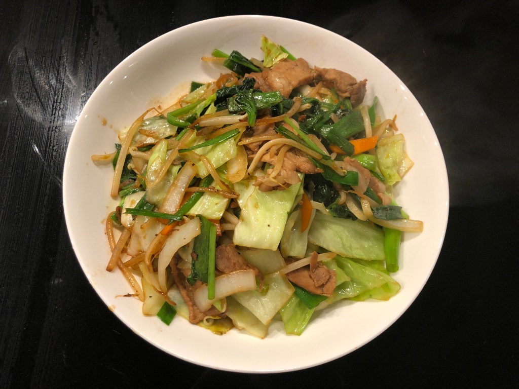 キャベツ、玉ねぎ、ねぎ、ニラ、ほうれん草、もやし、にんじん、豚肉の野菜炒めです。