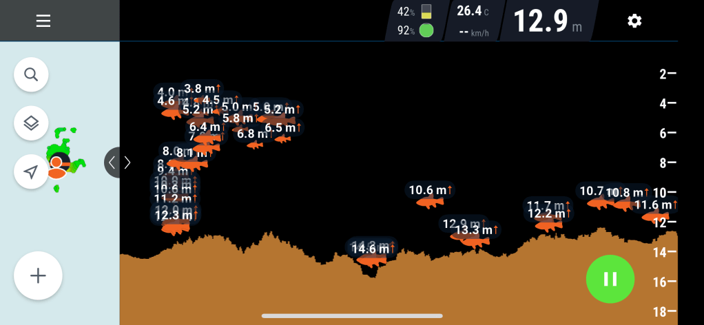 1回遠投するとディーパーが浮かんでいる位置の水深がわかるので、リールで巻いていくと全ての水深と地形(かけ上がり等)がわかります。