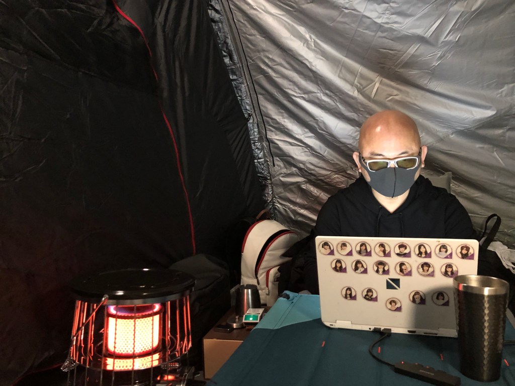 雨が降ってきたのでバーベキューをやめてテントに戻り、ストーブで暖をとりながら問題作成中です。