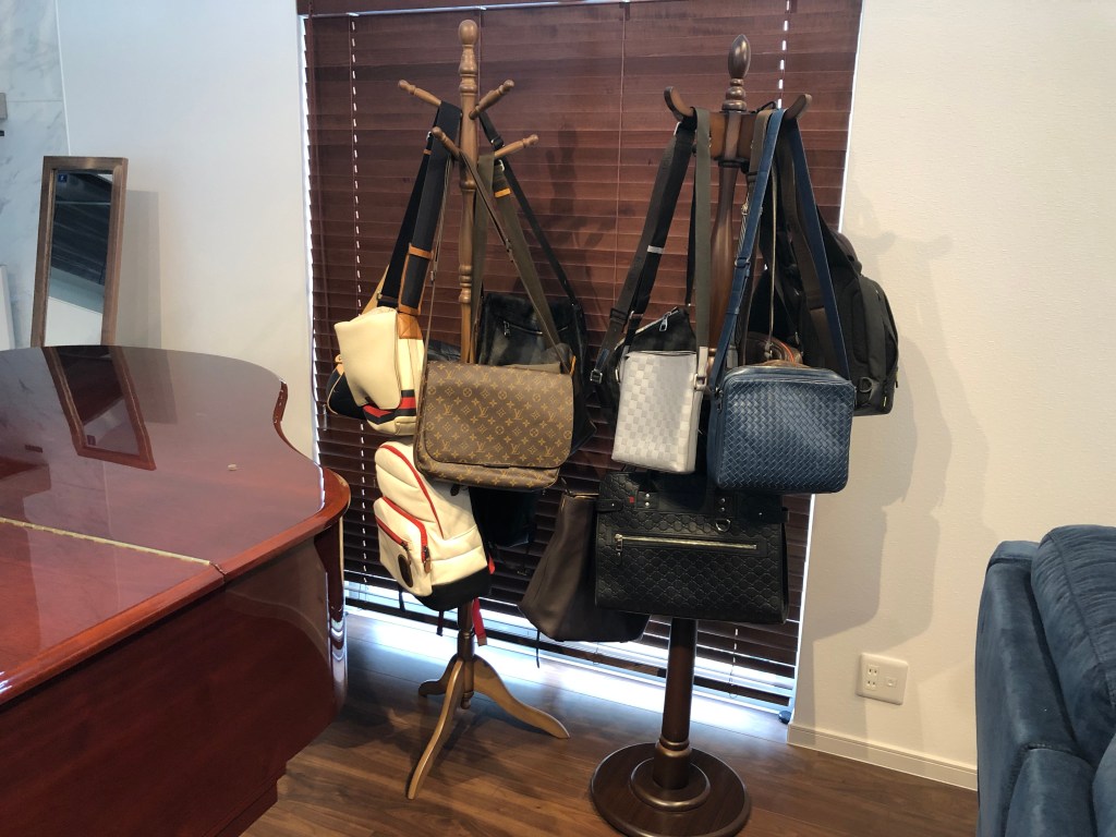 今日はグランドピアノの後ろのハンガーラックにバッグをまとめてみました。