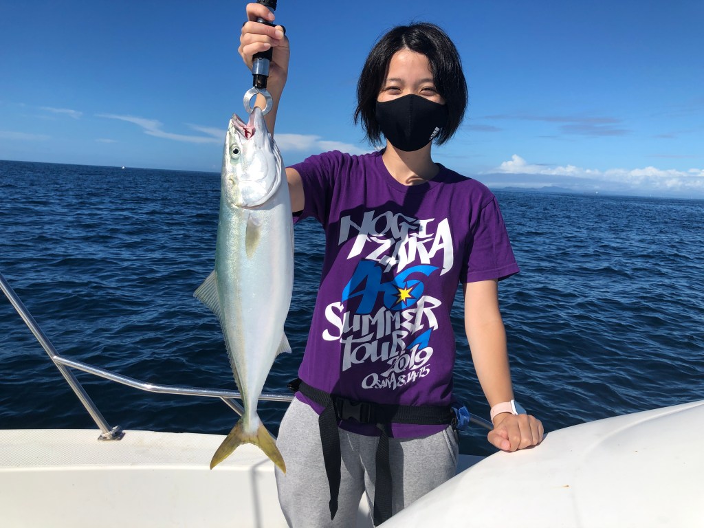 食いが渋い中、50cmくらいのハマチが釣れました。