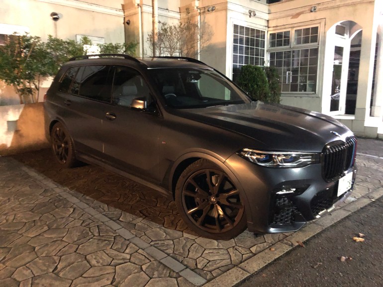 BMWのX7M60です。530馬力で価格は2000万円。すごいです。車は置いて帰るので飲んでも大丈夫です。