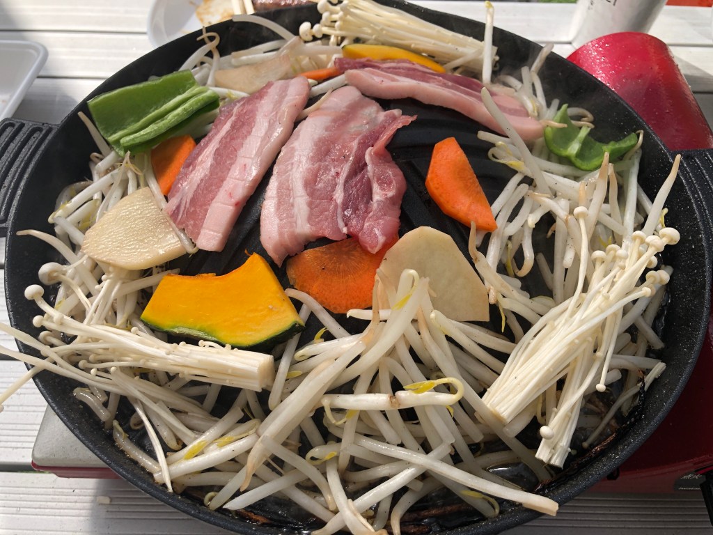 ボール型の鉄板の中央からバターと焼肉のタレを落とすと、鉄板の溝を通って全体に行き渡ります。それらが染み込んだ野菜を食べるのが醍醐味です。