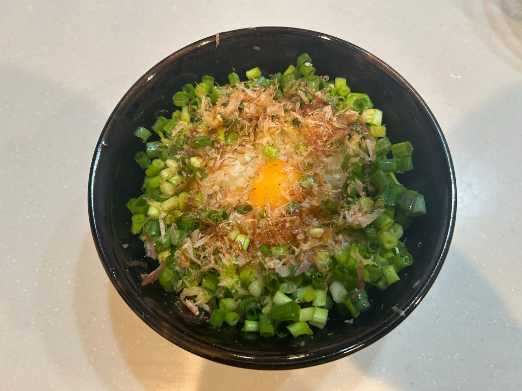 白ごはんにきざみネギとかつおをまぶして、中央には生卵、そして薄口醤油をかけて大量の唐辛子。