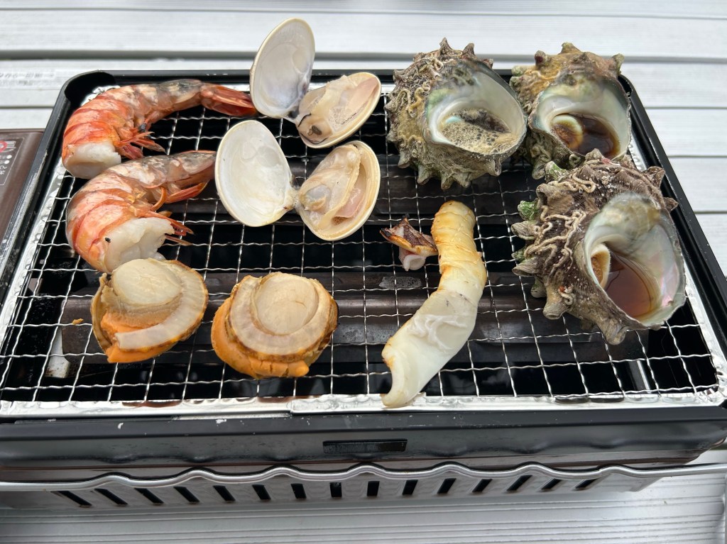 今回の海鮮バーベキューは、いつものサザエやハマグリに加えてエビやイカやホタテを入れましたが、めちゃくちゃ良かったです。