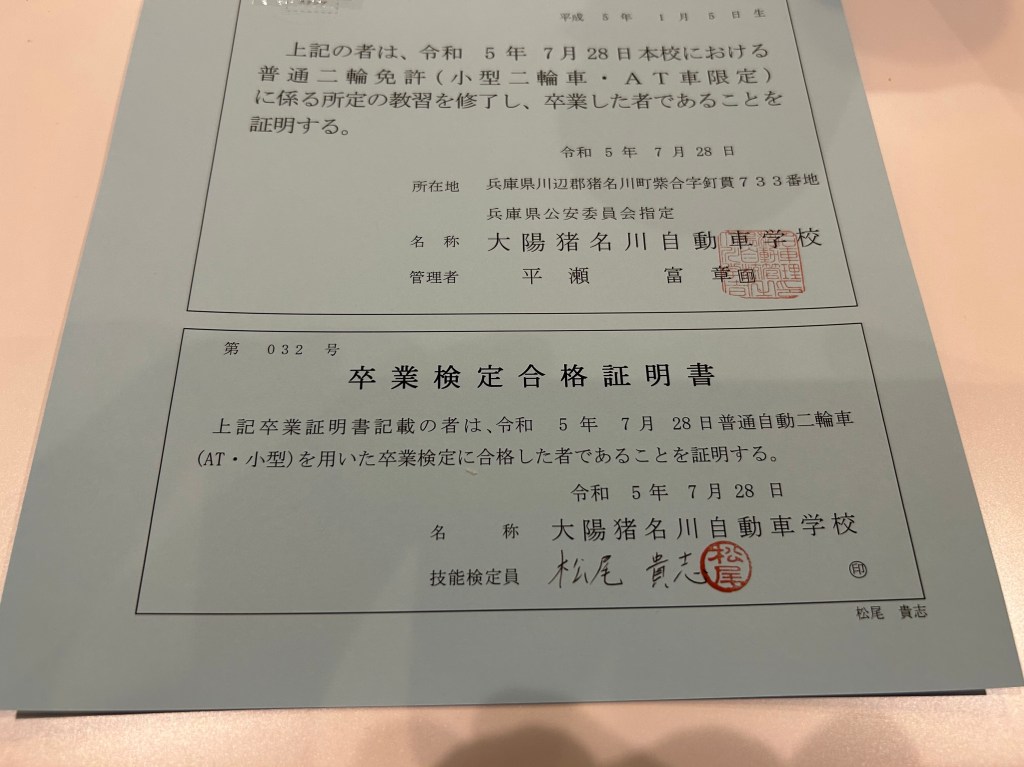あとは月曜日に明石の試験場で免許を交付してもらうだけです。卒業検定に一発合格した未希は昨日ずっと超ハイテンションでした(笑)