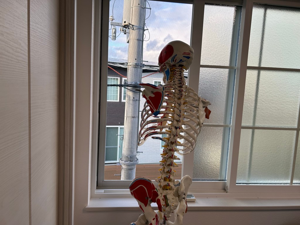 外で子供達が遊んでてうるさいので、骨模型を子供らの方に向けておきました。